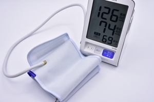 使用しているのは、自動で測れる電子式の血圧計です。腕にやわらかいカフ(帯)を巻き、ボタンを押すとゆっくりと空気が入り、数十秒で血圧が表示されます。